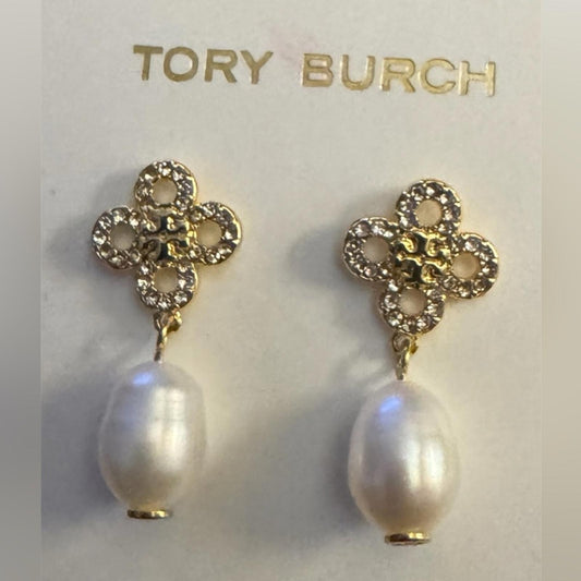 Tory Burch Gold Floral Earrings with Pearl Accent